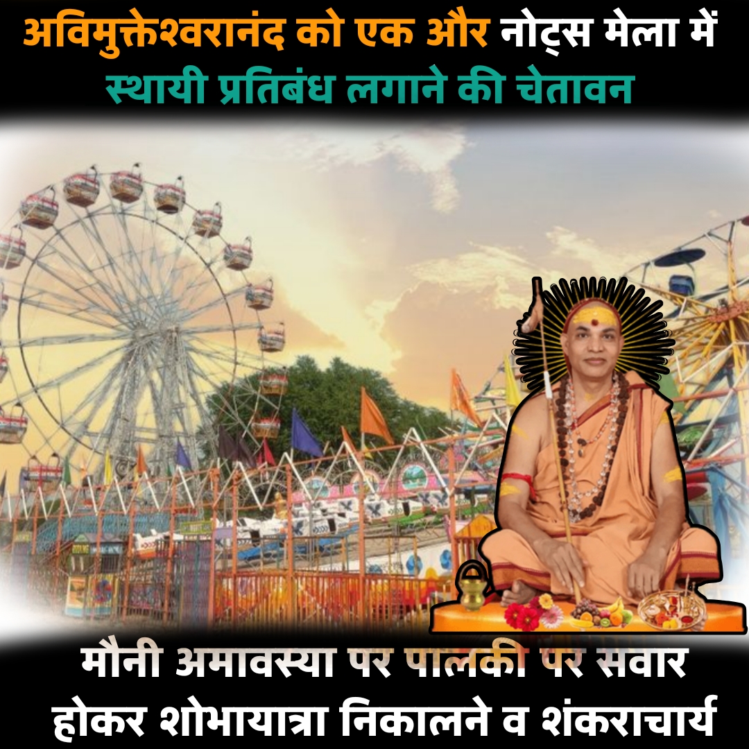 चेतावनी भी दी गई है कि क्यों न आपकी ( अविमुक्तेश्वरानंद) संस्था को दी जा रही सुविधा और भूमि आवंटन को रद करते हुए स्थायी रूप से मेले में आपके प्रवेश पर प्रतिबंध लगा दिया जाए